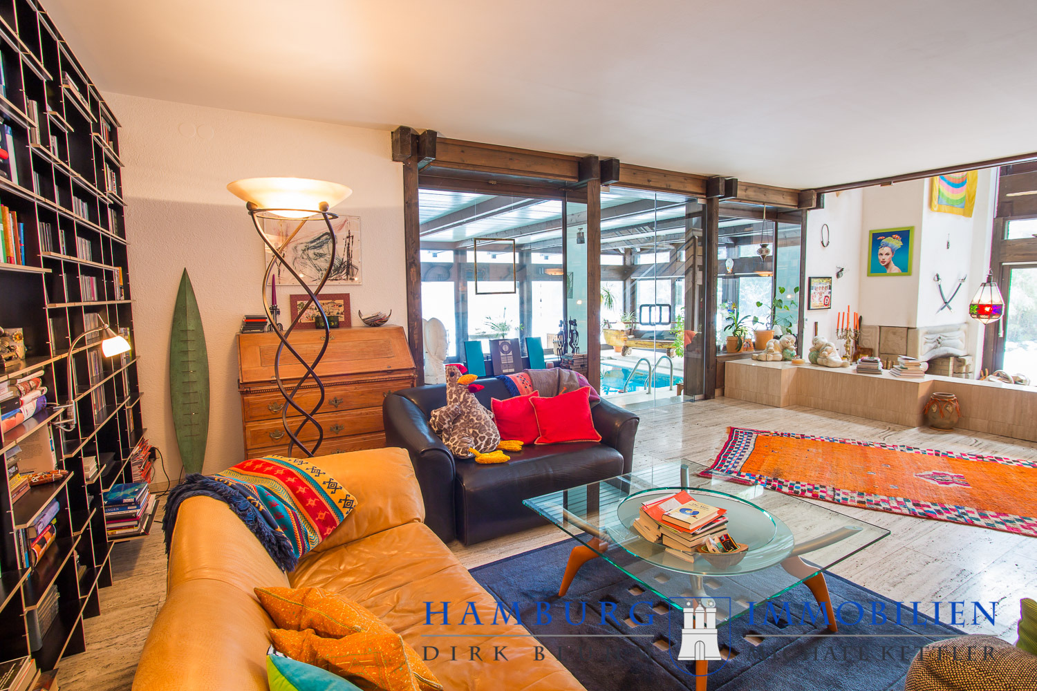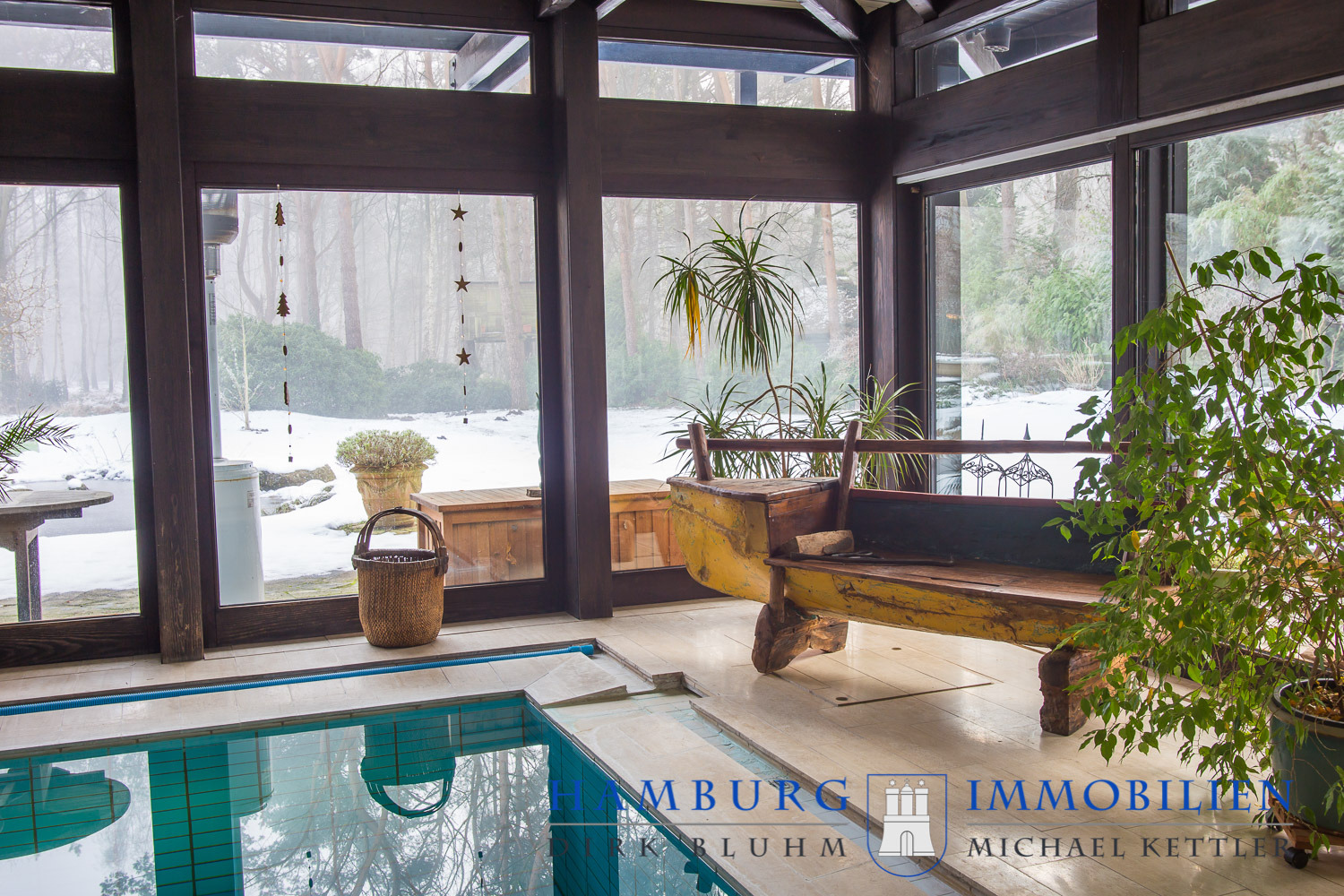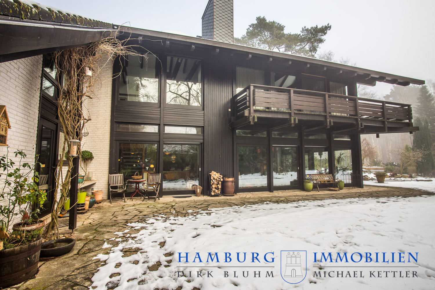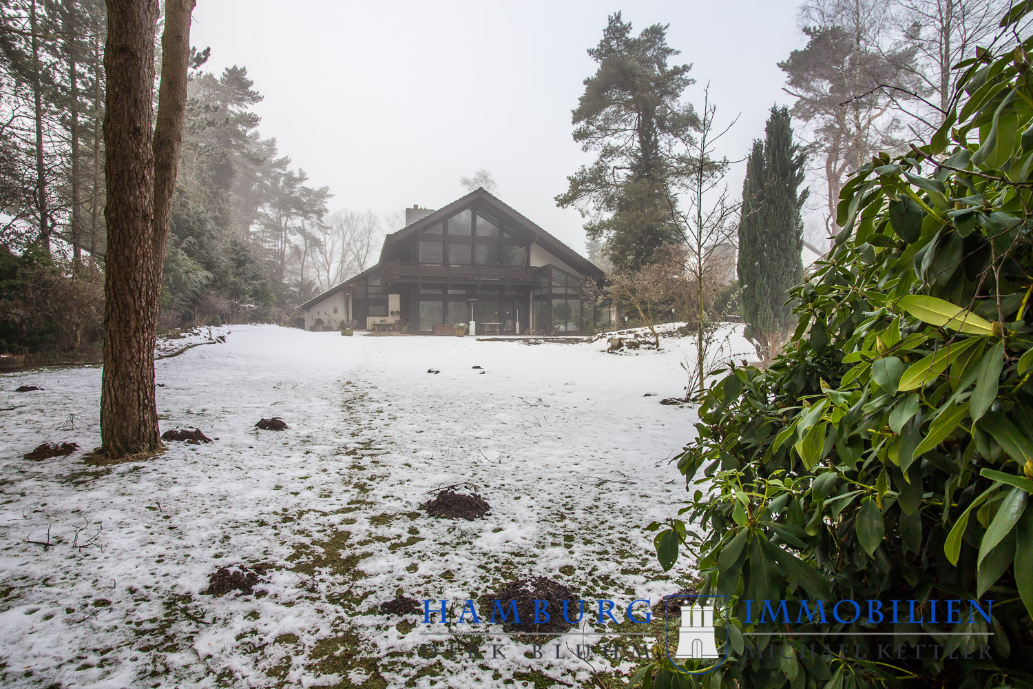 Hier erwerben Sie ein sehr großes Architekten-Landhaus mit unverbaubarem Blick auf das Alster-Landschaftsschutzgebiet (ca. 530 m² Wohn-/Nutzfläche) inklusiv einer Schwimmhalle von ca. 73 m² mit Innenpool mit Gegenstromanlage (ca. 8 x 4 m) und einer ca. 66 m²-2-Zimmer-Einliegerwohnung auf einem ca. 5.300 m² großen teileingezäunten Waldgrundstück.