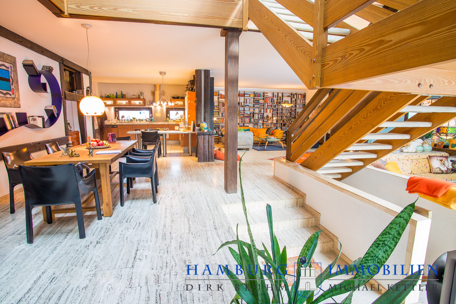 Wohnhalle mit offener hochwertiger SieMatic-Einbauküche, Essbereich und Kaminecke von ca. 84 m²