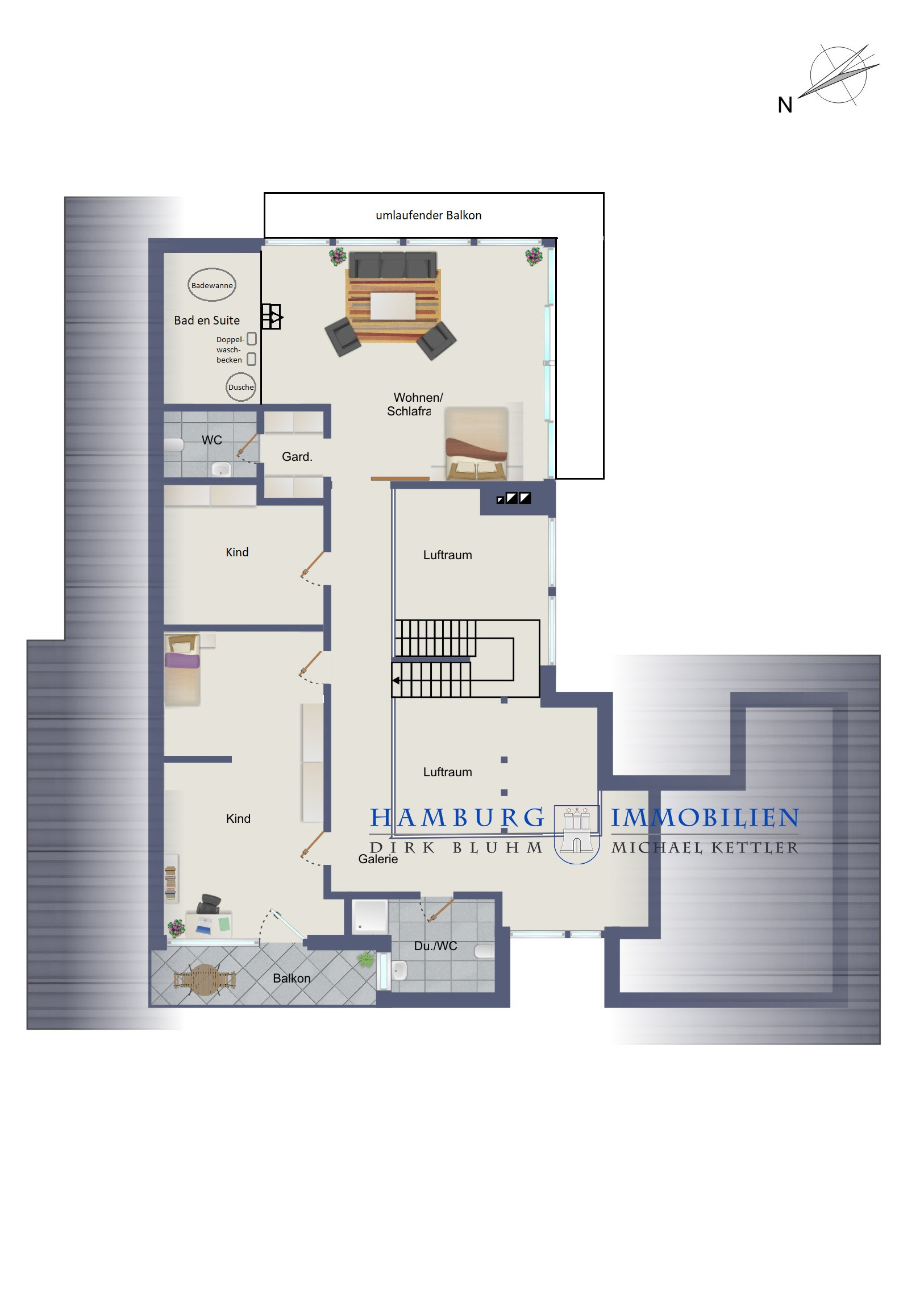 - Haupt-Schlafzimmer von ca. 54 m² mit Bad en Suite mit umlaufendem Balkon im Obergeschoss