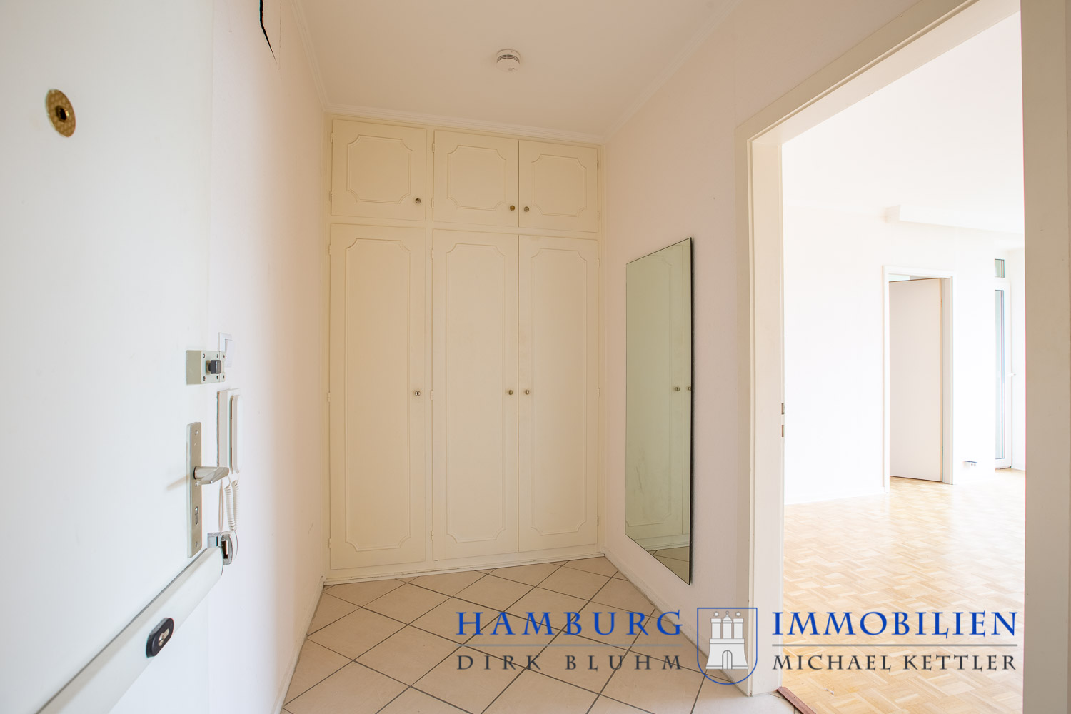 Bereits der hell geflieste Eingangsbereich verleiht der Immobilie die Großzügigkeit, die sich in der gesamten Wohnung weiter fortsetzt. Der Flur bietet Ihnen Zutritt zum Wohnbereich und allen weiteren Bereichen der Wohnung sowie zum Badezimmer. Großzügige, mit weißen Türen versehehe, Einbauschränke eignen sich optimal als Stauraum.